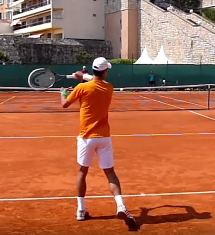 ジョコビッチのフォアハンドストローク(後ろから見た) 後ろから見たジョコビッチのフォアハンドストローク:テイクバックで、ラケット面を裏返し気味にすることで、リストワークを効果的に使うことができている。インパクトで左脇を締め、身体の左半身に壁を作って強打している。また、インパクトで右脇が締まって窮屈な体勢でボールをヒットしており、力が凝縮されている。フォロースルーでラケットをネット方向に大きく振っており、ボールを狙った方向にコントロールして打っている。